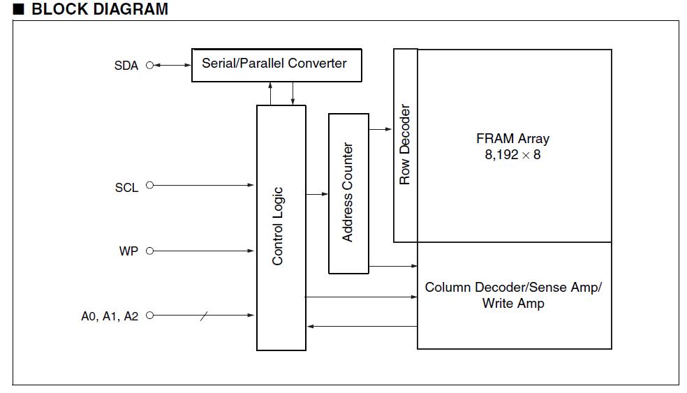 MB85RC64PNF-G-JNERE1 features: (1)Bit configuration: 8,192 words × 8 bits; (2)Operating power supply voltage: 2.7 V to 3.6 V; (3)Operating frequency: 400 kHz (Max); (4)Two-wire serial interface: I2C-bus specification ver. 2.1 compliant, supports Standard-mode/Fast-mode. Fully controllable by two ports: serial clock (SCL) and serial data (SDA); (5)Operating temperature range: -40 to +85℃; (6)Data retention: 10 years ( + 55 ℃); (7)Read/write endurance : 1010 times; (8)Package: Plastic / SOP, 8-pin (FPT-8P-M02); (9)Low power consumption: Operating current 0.15 mA (Max: @400 kHz), Standby current 5 μA (Typ).